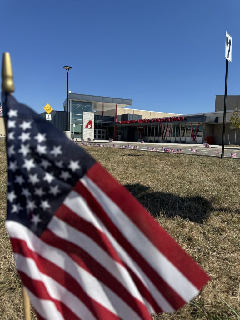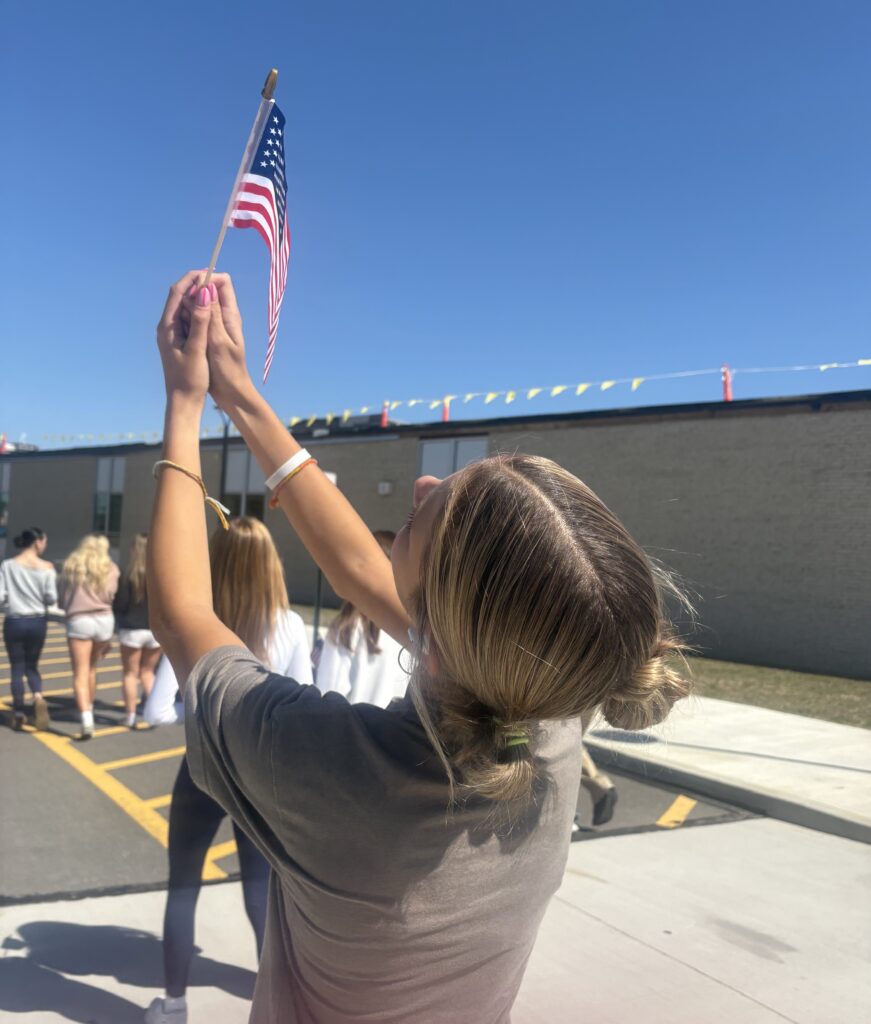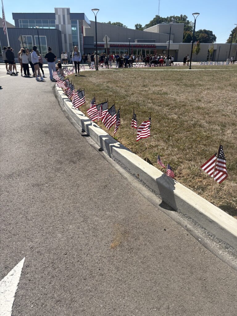 Last year, students gathered around the flagpole while the choir sang the National Anthem. This year, Dr. Dwuilt instead asked students to line the new grass circle, and between the middle school now holding 6th grade up to the current seniors, a potential for 1000 students to place a flag existed.