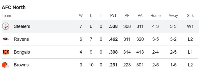 The Steelers currently stand in first place at 7-6 in the AFC North. Having only a one game lead, but its more like a two game lead when you factor in head-to-head matchups. But it’s not just the Ravens that have a chance to win the division. The Bengals also have a chance, even at 4-9, to still take the top spot in the AFC North.