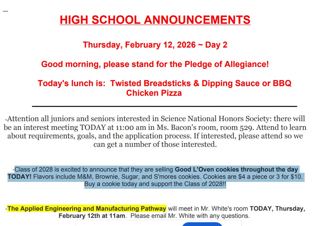 Class of 2028 is excited to announce that they are selling Good L’Oven cookies throughout the day TODAY! Flavors include M&M, Brownie, Sugar, and S’mores cookies. Cookies are $4 a piece or 3 for $10. Buy a cookie today and support the Class of 2028!!
