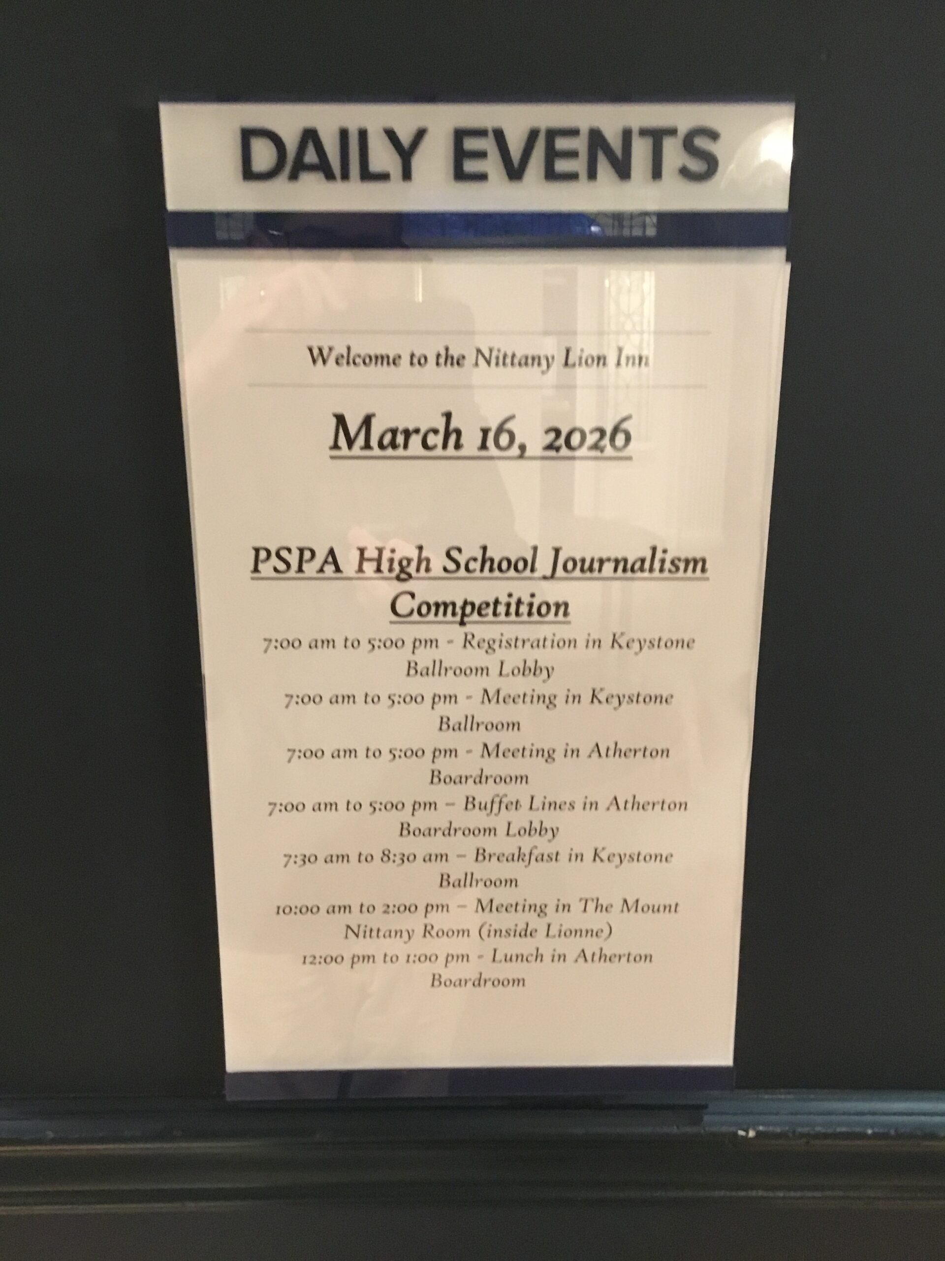Current co-editor-in-chief Pedro Moreira and Editorial Staff Member Lyra Klinedinst returned a year later to PSU Main Campus for the PA School Press State Championships. For the first time, the event was held on campus but in the Nittany Lion Inn.