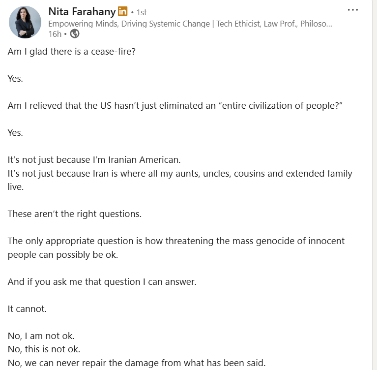 Farahany makes an important point: you don’t need to be directly connected to the war to care about what is happening. It can be difficult to empathize with those in war-torn countries, but the important thing is recognizing the horror and sheer agony, even if you cannot relate to it. Where I do disagree is the end of her post: “we cannot repair the damage from what has been said.” I’m not an Iranian-American, so I can’t properly speak to the true effect Trump’s words have had on Iranians, but I do not believe that any action or phrase is completely irreparable to an entire community. I do not believe that any one person has enough power to dismantle an entire, century-old community, and that speaking out against him has much more power than discussing the damage that has been caused.