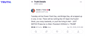 In this post and the last, there is a strange juxtaposition present that affects both posts. Trump claims, with unfit certainty, that the entire Iranian “civilization will die tonight,” and then finishes the post with “God Bless the Great People of Iran!” Not only is the indifference to the murder of an entire race horrific, disturbing, and borderline inhuman, but Trump does not even claim this ideology when he was the one who presented it. It is almost as though he is unwilling to take his own aggression against Iran seriously, as it seems to be diluted by the time he finishes the tweet with a blessing. It could be a psychological tactic to convince those that this is okay, it could be sarcasm, or it could just be sheer forgetfulness or carelessness. I don’t think we’ll ever know.